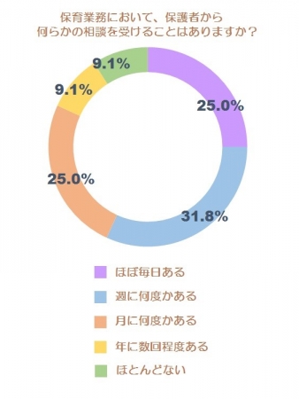 今回アンケートにご協力いただいたのは、保育士を中心とした44名の読者の皆さま。まずは日常の保育業務で、どれくらい保護者から相談を受ける機会があるか伺ったところ、「ほぼ毎日ある」と回答したのは25.0%、「週に何回かある」と回答したのは31.8%、「月に何回かある」が25.0%、「年に数回程度」「ほとんどない」と回答したのはそれぞれ9.1%と、多くの方が定期的に保護から何らかの相談を受けていることがわかりました。
