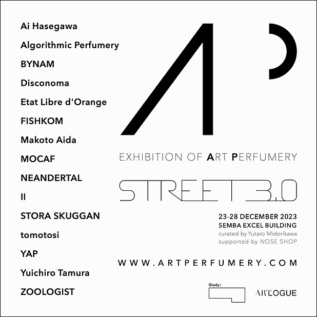 アート香水の最先端である「Art Perfumery(アートパフューマリー)」を紹介する展覧会。アートパフューマリーはそれぞれ特殊な空間をつくっている。「アート」、「香水」、「ストリート」という、一見遠い組み合わせが出会う場所、そして、多様なアートパフューマリーの世界にアクセスするための道の名前が『AP』。