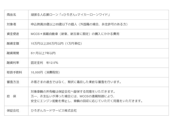広島銀行とGMSは、今回の提携により、安定した収入を得て返済能力を持っているにも関わらず、過去のローン返済状況等の理由から必要な車両の手配ができない方々のニーズに応え、本オートローンを提供してまいります。