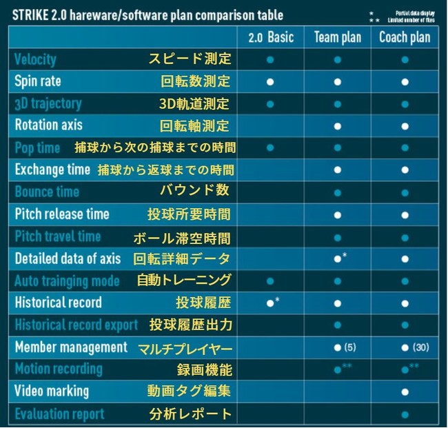◆【スマート野球ボールSTRIKE2.0】プラン機能一覧表及び測定データ