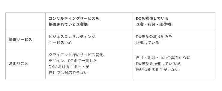様々な分野でコンサルティングサービスを提供されている企業様や、DXを推進している企業・行政・団体様とともに、クライアント様のDXへの取組みを促進する制度です。