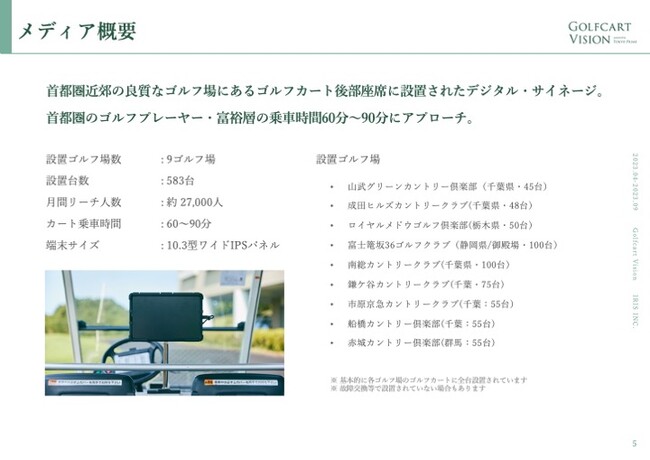 株式会社IRIS(本社:東京都港区、代表取締役:眞井 卓弥・宇木 大介、以下IRIS)は、ゴルフカートナビ国内導入実績約1,100コースの株式会社テクノクラフト(本社:新潟県新潟市、代表取締役:栂坂 昌業、以下テクノクラフト)と共同で提供しているゴルフカートサイネージメディア「Golfcart Vision(R)? poweredby Tokyo Prime」(以下、「Golfcart Vision」)の2023年4月- 9月度媒体資料を本日2023年2月6日(月)に公開しました。