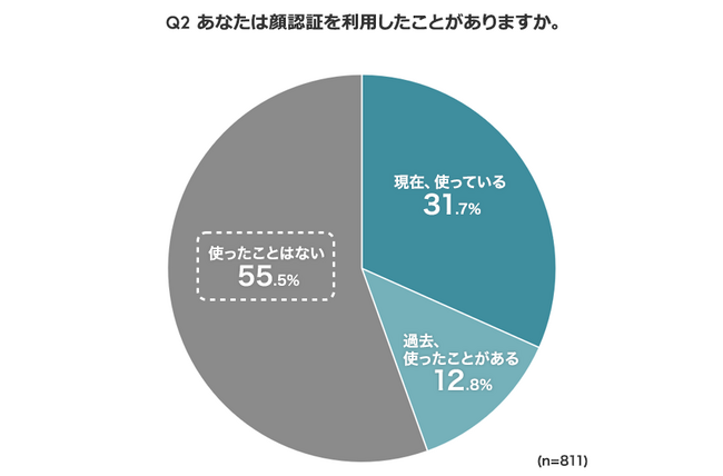 また、顔認証を利用したことがあるか聞いたところ、「使ったことはない」が55.5%で最も高く、現在利用している人(31.7%)は3割強で、過去利用したことがある人(12.8%)は1割強にとどまりました。