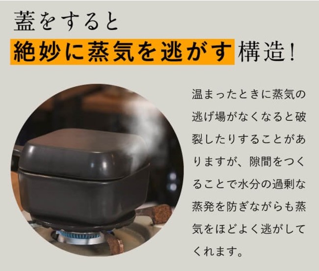 蓋をした際にできる絶妙な隙間が、水分の過剰な蒸発を防ぎながらほどよく蒸気を逃がします。