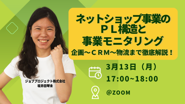ハタラクをつくる、楽にする、楽しむソリューションを提供するジョブプロジェクト株式会社(本社:東京都新宿区、代表取締役:鈴木 貴大 https://job-project.com/ 以下、ジョブプロ)は、この度、「ネットショップ事業のPL構造と事業モニタリング」と題し、EC事業の一般的なPL構造から、事業を伸ばしていく際のKPI設計まで事例をもとに解説するセミナーを2023年3月13日(月)17:00〜開催いたします。
