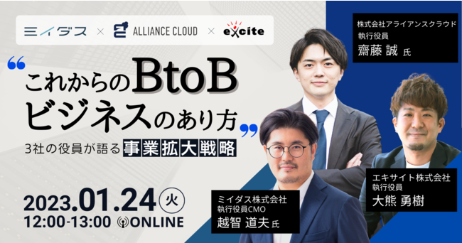 決裁者アポイント獲得支援SaaS「アポレル」を運営する株式会社アライアンスクラウド(代表者:宮崎 翔太 本社:東京都目黒区)は、エキサイト株式会社、ミイダス株式会社、の3社共同で「これからのBtoBビジネスの在り方 3社の役員が語る事業拡大戦略」をテーマに2023年1月24日(火)12:00〜より参加費無料のウェビナーを開催します。