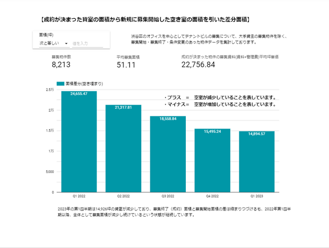 下のグラフは、成約が決まった貸室の面積と新規に募集開始した空き室面積の差分面積を表現しています。渋谷区に関しては、段階的に差が縮まっているもののどの期間も成約物件面積が空き室面積を上回っており、市場全体として空き室の面積が減少していることがうかがえますが、その幅は減ってきています。