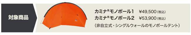 キャンペーン期間中、全国お取扱い店舗、またはfinetrack直営店(TOKYO BASE、HIBIYA HUT、WEB STORE)で、カミナ(R)モノポール1もしくはカミナ(R)モノポール2をご購入いただいたお客様へ、オールロードバイクなどの自転車でのツーリングで活躍するツーリングバッグもしくはテントのボトムを汚れや傷から保護するフットプリントのどちらかを先着でプレゼント!