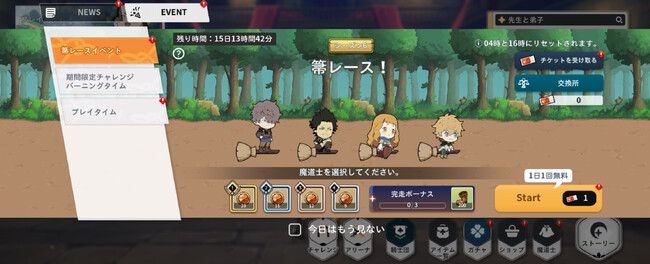 箒レースに参加する魔道士の中から1体を選択し、選択した魔道士のレース結果に応じて「箒レースコイン」を獲得できるイベントです!獲得したコインは「イベント交換所」で様々な報酬と交換できます。