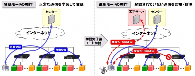 正常時のネットワーク上のやり取りを予め学習して通信端末の許可リストを自動登録しておくことで、許可リストにない不正な通信をブロックする機能。