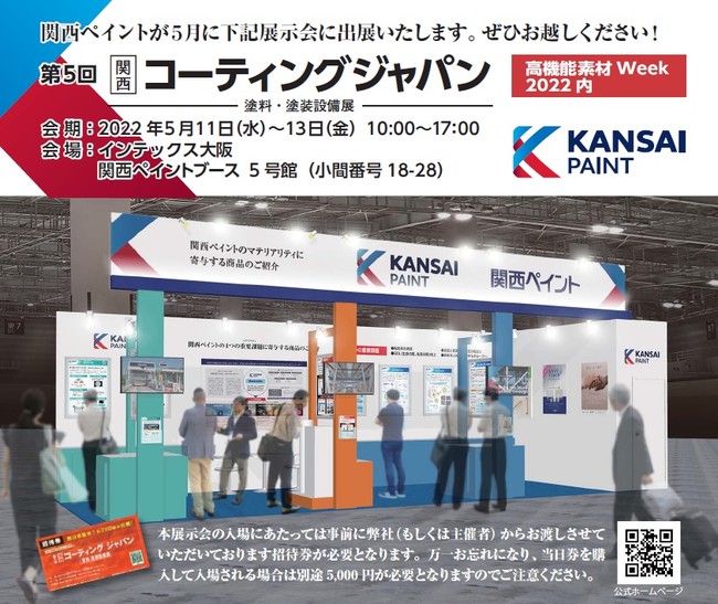 関西ペイント株式会社(本社:大阪市、代表取締役社長:毛利 訓士)は、は2022年5月11日(水)〜13日(金) インテックス大阪にて開催される展示会〈第5回(関西)コーティングジャパン〉へ出展いたしますのでお知らせします。