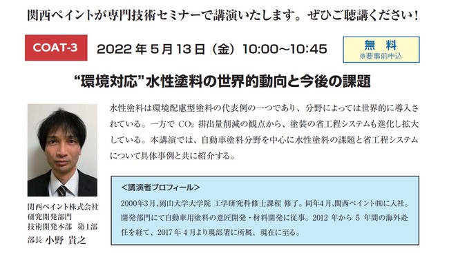 講演名:COAT-3 “環境対応” 水性塗料の世界的動向と今後の課題