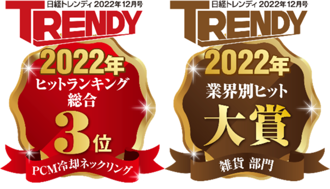 人間の平均体温よりも低い28℃で凍結、充電せずに使いまわしができる熱中症対策アイテム「アイスリング」は、昨年SNSを中心に話題となり、前年度から約17倍の売上を突破、累計販売数は70万個以上の大ヒットで各店舗とも品切れが続出。『新・夏の必需品』として、日経トレンディ“2022年ヒット商品ベスト30”の3位にPCM冷却ネックリングがランクインしました。