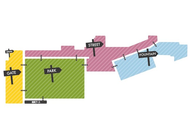 今回のrooms PARKは4つのエリアで構成されています。 入口となるGATEは、モニュメントや話題のフード等、来場者を迎える象徴的なエリア。 インキュベーションプロジェクトとして設けた、チャレンジブースを中心としたSTREETエリア。 クリエイションの湧き出る場所をイメージし、ファッションブランドを中心とするFOUNTAINエリア。 エシカル・伝統工芸・インテリア・ライフスタイル・アクセサリーなど様々なジャンルのブランドが広がるPARKエリア。
