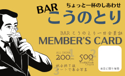 また、1,500円にて「BAR こうのとり 1日VIP会員」になって、さらに楽しめます。