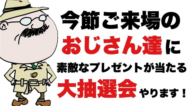 ご来場のおじさん達を対象に素敵なプレゼントが当たる抽選会を行います。