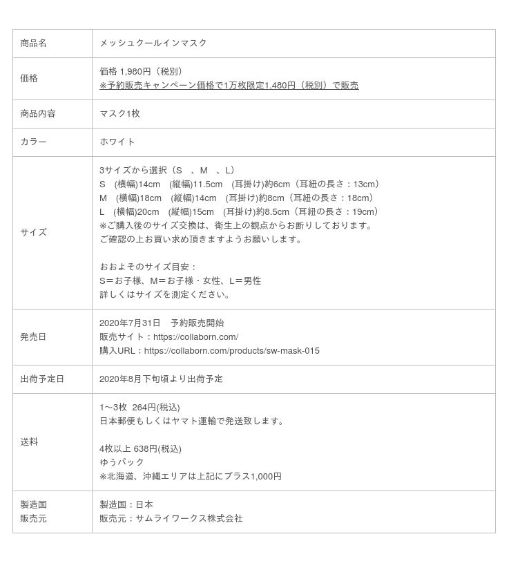 サムライワークス株式会社(代表取締役社長:新島 実 本社所在地:東京都渋谷区)は、夏向けの新型コロナウイルス感染防止・熱中症対策として、接触冷感に加えて暑さの原因となる通気性を重視し、その上で3層構造による飛沫防止、また抗菌性を兼ね備えた夏用マスク「メッシュクールインマスク」の予約販売を開始します。