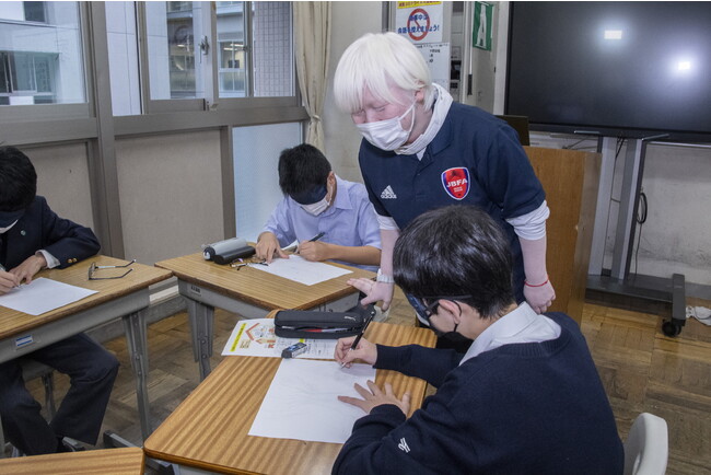 最初に、視覚障がい者がアイマスクで視覚を完全に閉じた状態でプレーする「ブラインドサッカー」の競技のルールについて紹介した後、視覚障がい者への理解を深めるため、アイマスクを着けた状態でテーマに沿った絵を描く演習を行ないました。次に、メンバー同士で意思疎通を図り、コミュニケーションをとりながら一人一人がテーマに沿った絵を描くグループワークを実施しました。一人では難しい作業でも、他者の意見やアドバイスを聞き助け合うことで、一人で描くよりもうまく絵を描くことができたことから、生徒たちは「同じ情報でも人によって様々な伝え方がある」という気づきや「ダイバーシティ」の基本的な考え方を身をもって体感していました。