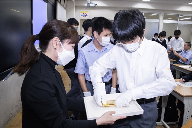 「生活の身近なところにある貴金属とリサイクルの重要性」を考えることを目的とした貴金属に関する授業では、貴金属の種類やその特性を紹介した後、貴重な資源である貴金属をリサイクルするため重要となる都市鉱山の存在や、都市鉱山から貴金属を回収し、純度の高い金を精製する工程について紹介しました。1kgの金地金に実際に触れる体験では、同じ1kgの重さの水と比較して、密度の違いについても学習しました。生徒は、「同じ重さのはずなのに、実際持ってみると金のほうがより重く感じられる」と驚くと同時に、初めて触れた地金の手触りや輝きもしっかりと確かめていました。授業の後半では、貴金属が部品や素材としてどのような製品の中で生活に役立っているのかイラストを見ながら話し合い、自動車やスマートフォンなど身近な製品の中で活躍する貴金属について理解を深めました。最後に、貴金属の熱伝導率を理解するために、代表の生徒が純銀製のスプーンを使ってアイスクリームを試食しました。生徒からは「スプーンを伝わってアイスの冷たさが感じられて、純銀の熱伝導率のすごさがわかった」との感想が寄せられました。