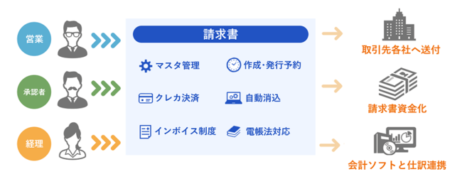 「請求QUICK」は、Webブラウザで利用できるクラウド型請求書発行システムです。請求書をWeb上で作成・承認・発行できることに加え、全国の金融機関と連携することで入金消込の手間を大幅に軽減することを実現しています。さらに、会計ソフトと連携することで、請求書発行にかかる社内の業務フローを明確にし、請求書の発行から消込、会計処理までの作業を効率化することができます。