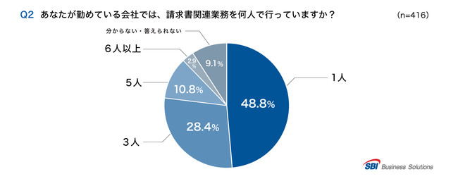 次に、請求書関連業務を何人で行っているかという質問に対して、約半数にあたる48.8%が「1人」と回答しており、請求書の作成、送付、入金確認、督促、仕訳計上など、多岐にわたる請求書関連業務を担当者1人で行わなければならない、いわゆる「1人経理」問題が改めて浮き彫りになりました。
