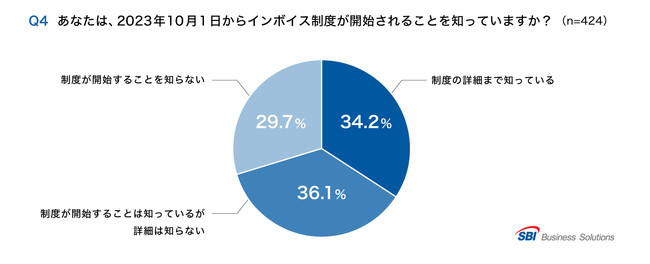 また、2023年10月1日開始予定のインボイス制度について尋ねたところ、「制度の詳細まで知っている」と回答したのは34.2%にとどまり、29.7%の人は未だインボイス制度そのものを認知していないことが明らかになりました。