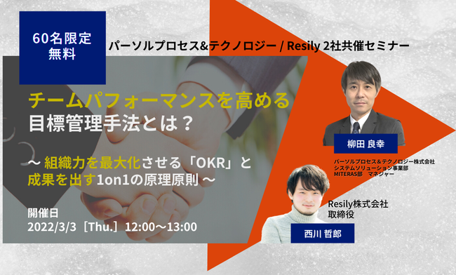 Resily株式会社(リシリー 本社:東京都千代田区 代表取締役:堀江真弘、以下、Resily)は、パーソルプロセス&テクノロジー株式会社と共催の無料セミナー「チームパフォーマンスを高める目標管理手法とは? 組織力を最大化させるOKRと成果を出す1on1の原理原則」を、2022年 3月3日(木)12:00 - 13:00 にオンラインにて実施します。