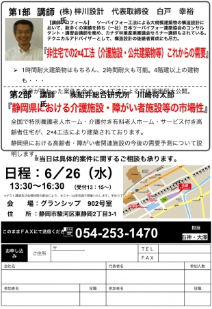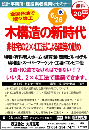 株式会社ZENホールディングス(本社:東京都千代田区、代表取締役社長:小林憲司)傘下の株式会社大成住宅(本社:静岡県静岡市葵区、代表取締役社長:望月久雄)では、6月26日、静岡県静岡市駿河区のグランシップにて、設計事務所・建設会社向け「木構造の新時代〜非住宅の2×4工法による建築の勧め」無料セミナー を開催いたします