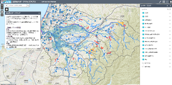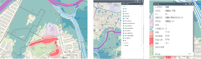 デジタル化したハザードマップは洪水・高潮等の浸水想定区域、土砂災害警戒区域等や地震による揺れやすさなど、それぞれの情報をレイヤーで選択しながら表示できるため、リスク情報が一目瞭然。「情報が多すぎる」「災害の種類に応じて複数のマップを見なければいけない」という煩雑さがありません。また、避難所等を選択すると住所や標高、対応している災害の種類などの情報を参照することが可能です。