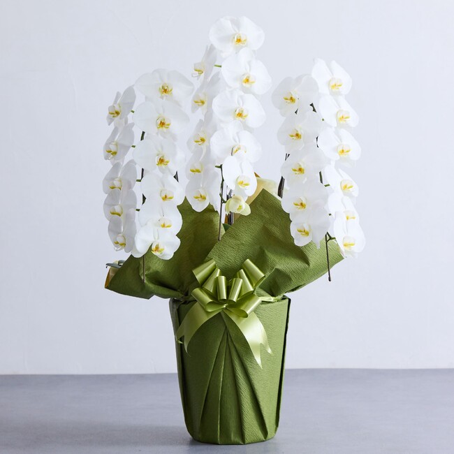 ラインナップは立て札やラッピングをお選びいただける「胡蝶蘭2本立(15,480円)」、「胡蝶蘭3本立(21,980円)」、「胡蝶蘭5本立(36,980円)」のほか、白と金の洗練されつつも華やかなカラーリングの鉢でお届けする「胡蝶蘭ミディ2本立白(7,480円)」、「胡蝶蘭ミディ2本立ピンク(7,480円)」、「胡蝶蘭ミディ3本立MIX(8,890円)」の全6種を展開。幅広い価格帯で種類豊富、サービス充実のAND PLANTSの「胡蝶蘭」をぜひご利用ください。
