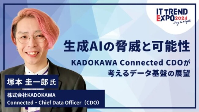 KADOKAWAグループで運営するサービスのインフラ開発・運用や、ICTコンサルティング、システムの設計・構築・運用、クラウドサービス、ビックデータサービス、働き方改革支援を手がける株式会社KADOKAWA Connected(所在地:東京都千代田区、代表取締役社長:安本 洋一、以下「KDX」https://kdx.co.jp/)のChief Data Officer(CDO)である塚本 圭一郎が、業界最大級のオンライン展示会『ITトレンドEXPO2024』にて「生成AIの脅威と可能性」をテーマにゲスト登壇いたします。