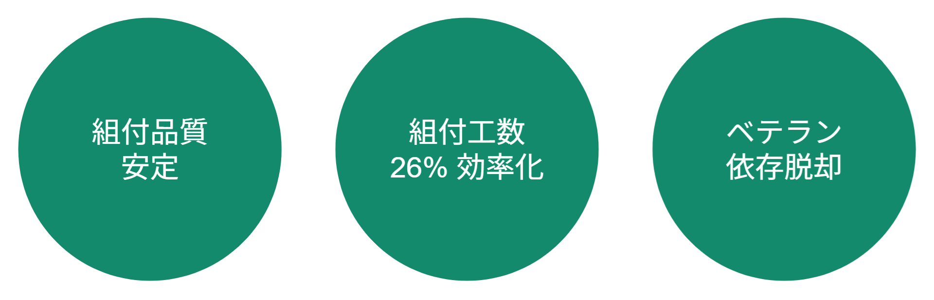 またそれ以外にも2点、価値を感じています。1つは品質を維持しながら、組付工数を効率化できた点です。もう1つはベテランなどの指示者をつけなくても、経験が浅いメンバーの組付が安定したことです。