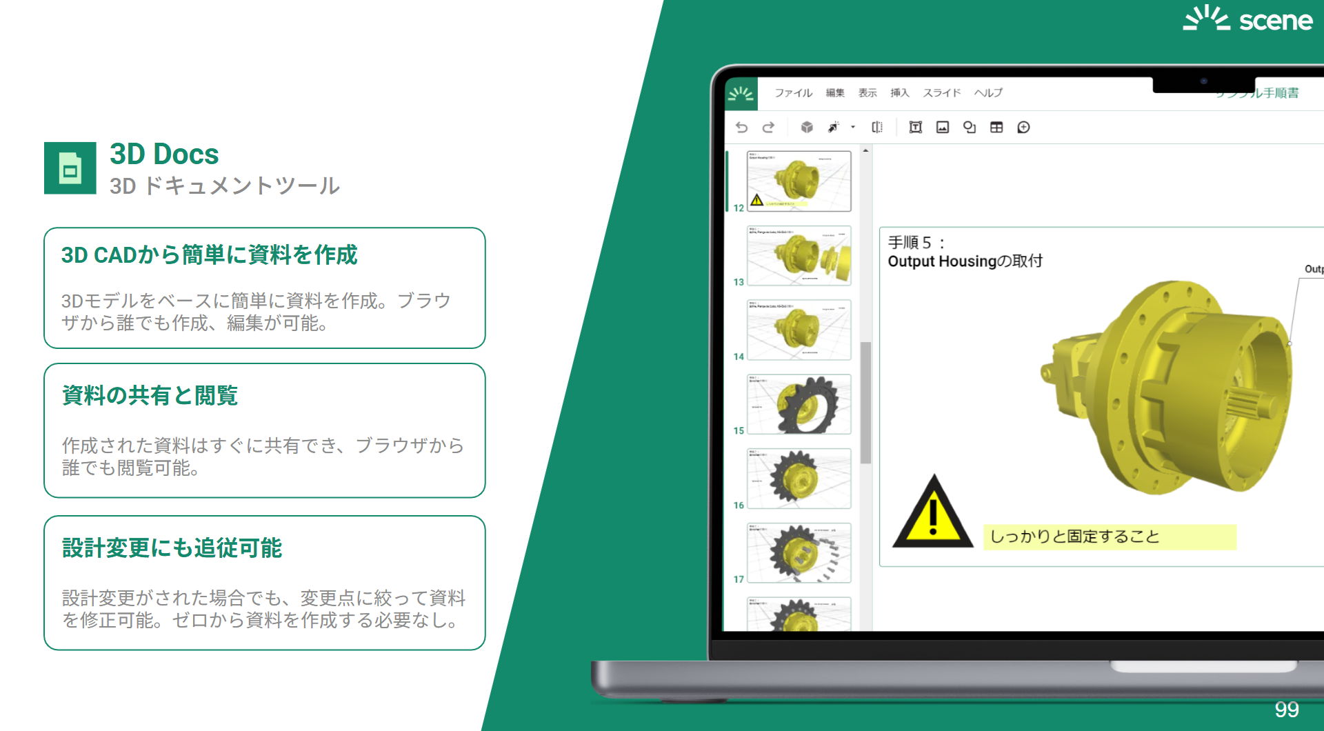 「革新者を力づけ、物理世界の変革を加速する」をミッションに、ものづくりのワークスペース『Scene Workspace』を開発・提供するScene株式会社(代表取締役 ビジャヤン・スワティナト 本社:東京都渋谷区)は、新明工業株式会社が、3Dモデルを活用したドキュメント作成ツール『3D Docs』導入により、ベテランの指示なしでも品質の安定を実現しながら、組付工数を効率化した事例を公開しました。