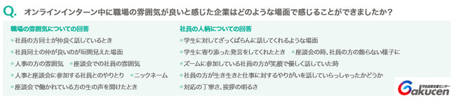 オンラインインターン中に職場の雰囲気が良いと感じた企業はどのような場面で感じることができましたか?