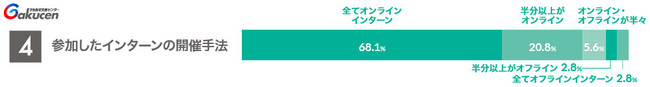参加したインターンシップの開催手法は「全てオンラインインターン」68.1%「半分以上がオンライン」20.8%とオンライン開催が多数を占めました。この結果から、学生が知りたかった「臨場感のある企業の様子」をオンライン開催のインターンシップでは知ることができなかったことがわかります。