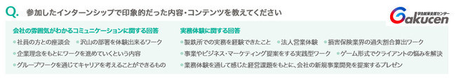 学生に夏期インターンシップのコンテンツについて、「印象的だった内容・コンテンツ」では、会社の雰囲気がわかるコミュニケーションについて好感を持つ意見が多数あり、実務体験と並んで評価されていました。