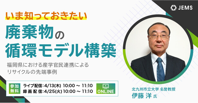 「ITで環境問題に挑む」をコーポレートスローガンに掲げる株式会社JEMS(本社:茨城県つくば市、代表取締役:須永裕毅)は、廃棄物処理・資源リサイクル業者様向けに、リサイクルの先進的な取り組みを解説する無料のオンラインセミナーを開催します。ライブ配信4/13(木)、録画配信 4/25(火)のうち、どちらかご都合のよい日程でご参加ください。