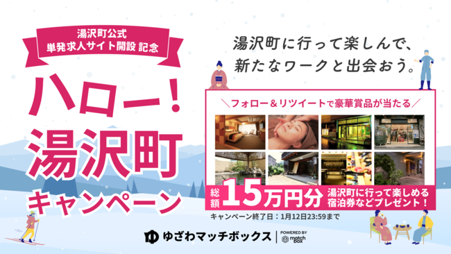 株式会社Matchbox Technologies(マッチボックステクノロジーズ 本社:新潟県新潟市中央区、代表取締役社長:佐藤 洋彰)はギグワーカーを含めた各社独自の人材プールを構築し、人材の採用にかかる時間やコストの削減を可能にすることができるプラットフォーム「matchbox(マッチボックス)」を提供しています。マッチボックステクノロジーズは2022年7月から、新潟県南魚沼郡湯沢町(町長:田村正幸 たむらまさゆき)のデジタル技術を活用した労働環境提供・効率化事業において、湯沢町独自のギグワークプラットフォーム「ゆざわマッチボックス(URL:https://matchbox.jp/niigata/yuzawa)」の導入・運用を受託しています。「自治体公式」の求人サイト「ゆざわマッチボックス」の登録者は今月600人を突破し※、湯沢町の魅力、湯沢町のお仕事を気楽に試せる「ゆざわマッチボックス」の魅力を知ってもらうため、公式Twitterアカウント(@YuzawaMatchbox)にて宿泊券や商品券など当選総額15万円相当が当たるTwitterフォロー&リツイートキャンペーン「ハロー!湯沢町キャンペーン」を実施します(キャンペーン紹介ページURL:https://matchbox.jp/niigata/yuzawa/dx-project/campaign/tw2022winter)。