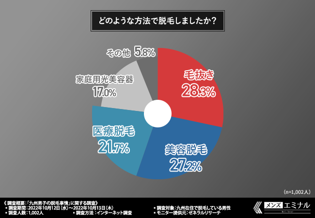 「どのような方法で脱毛しましたか?」と質問したところ、『毛抜き(28.3%)』と回答した方が最も多く、次いで『美容脱毛(27.2%)』『医療脱毛(21.7%)』『家庭用光美容器(17.0%)』と続きました。