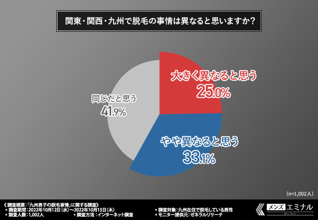 「関東・関西・九州で脱毛の事情は異なると思いますか?」と質問したところ、『大きく異なると思う(25.0%)』『やや異なると思う(33.1%)』『同じだと思う(41.9%)』という回答結果になりました。