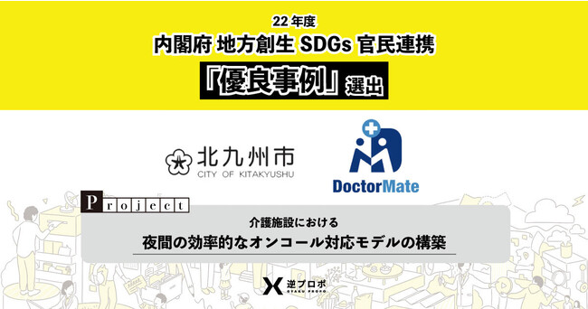 株式会社ソーシャル・エックス(本社:東京都渋谷区、代表取締役:伊佐治幸泰・伊藤大貴、以下「ソーシャル・エックス」)が提供する、官民共創による新規事業開発プラットフォーム「逆プロポ」(https://gyaku-propo.com/)を活用してパートナーシップが成立した、介護施設向けに「夜間オンコール代行(TM)サービス」を提供するドクターメイト株式会社(本社:東京都港区、代表取締役社長:青柳直樹、以下「ドクターメイト」)と、福岡県北九州市(市長:北橋健治)による実証事業、「介護施設における夜間の効率的なオンコール対応モデルの構築」が、内閣府にて募集した「地方創生SDGsに官民連携で取り組む事例」の中から、優良事例として選出されました。2023年2月7日(火)に開催する「地方創生SDGs国際フォーラム2023」にて表彰式を予定しています。