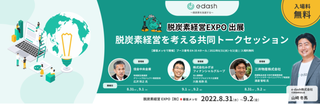 CO2排出量可視化のクラウドサービス「e-dash」を提供するe-dash株式会社(本社:東京都千代田区、代表取締役社長 山崎冬馬、以下「当社」)は、2022年8月31日(水)から9月2日(金)の3日間、幕張メッセにて開催される「脱炭素経営EXPO【秋】」に出展します。また、出展に伴い3日間に亘って各日2回、信金中央金庫、株式会社みずほファイナンシャルグループ(以下、「みずほフィナンシャルグループ」)、三井物産株式会社(以下、「三井物産」)の各社と共同トークセッションを実施致します。