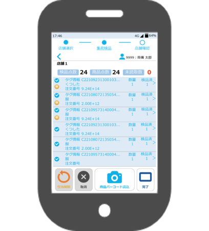 受注品の検品作業が、スマートフォンのカメラで商品タグ(下げ札)に記載されたバーコードを読み取るだけで出来るようになります。これにより、従来の目視による検品作業に比べ、よりミスの少ない効率的な検品をサポートします。JANコードやcode39など、物流用途で一般的に利用される7つのバーコード規格に対応しているため、様々なショップ・ブランドで汎用的にご利用いただけます。