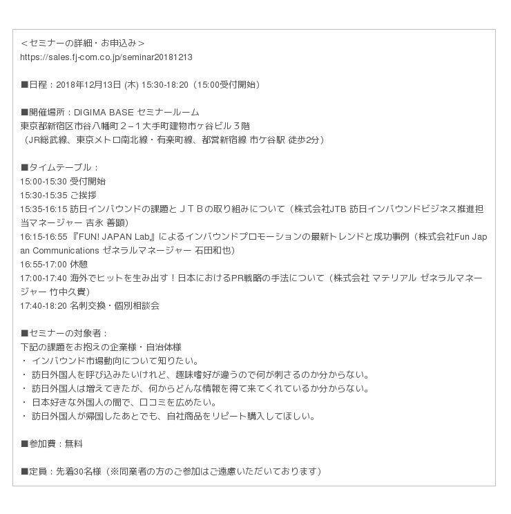 株式会社Fun Japan Communications(東京都港区 代表取締役 藤井大輔)は、株式会社マテリアル(東京都港区 代表取締役 東義和)と合同で、2018年12月13日(木)にインバウンドプロモーションの最新トレンド解説セミナーを開催します。