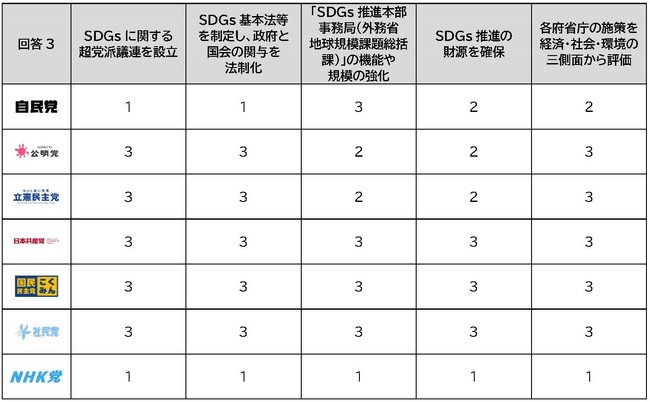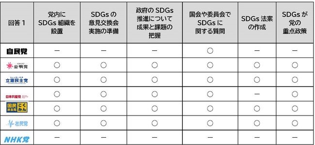 SDGsジャパンは、昨年の衆議院選挙でもSDGsに関するアンケートを主要政党に実施したところ、回答いただいたすべての政党が、SDGsは「重要であり喫緊の課題」としていました。今回のアンケートでは、SDGsの達成に向けて政党が取り組んでいる具体的な活動やSDGsに関する考えについて、合計4項目質問しました。