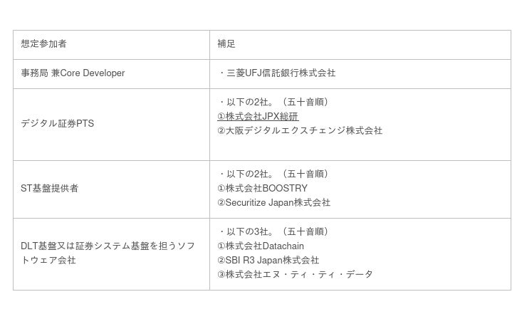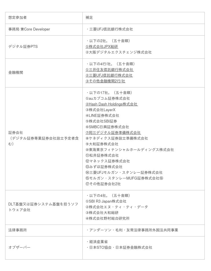 DCCでは、「資金決済WG」を2022年4月に設置し、関係当局のオブザーブの下、デジタル証券PTS*3、金融機関、証券会社、ソフトウェア会社及び法律事務所等31社と検討を進めています。