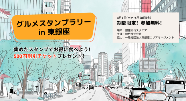 scheme verge株式会社と松竹株式会社は、一般社団法人東銀座エリアマネジメントと協力して、「グルメスタンプラリーin東銀座」を2023年4月1日から4月28日まで銀座松竹スクエアで開催いたします。対象飲食店やキッチンカーなど18店舗で税込500円以上の買い物をしてスタンプを集めると、500円の割引チケットがもらえるオトクなスタンプラリーとなっております。