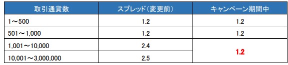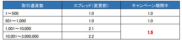 キャンペーン期間中の南アフリカランド/円、NZドル/円の1,001〜10,000通貨、10,001〜