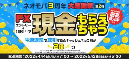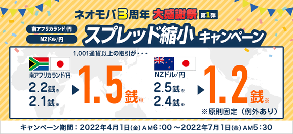 株式会社SBIネオモバイル証券(本社:東京都港区、代表取締役社長:小川裕之、以下「当社」)は、外国為替証拠金取引「ネオモバFX」において、2022年4月1日(金)から7月1日(金)まで、南アフリカランド/円、NZドル/円のスプレッドを縮小するキャンペーンを実施します。また、2022年4月4日(月)から5月28日(土)まで、「エントリー+1取引で現金もらえちゃうキャンペーン」を実施します。