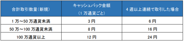 さらに、取引期間中の合計取引数量に応じて、1万通貨ごとに以下のとおりキャッシュバックします※。